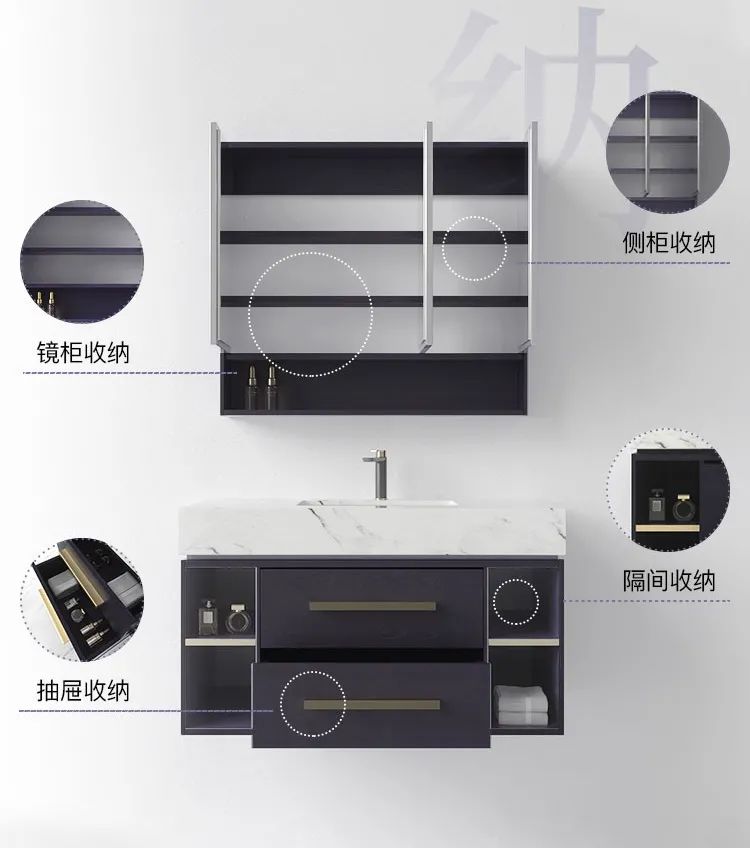 鏡柜+側(cè)柜+抽屜+隔間,鏡柜分為開放式和封閉式,開放式鏡柜空間大,可輕松收納漱口杯、牙膏、牙刷、潔面用品等,在日常洗漱時方便拿取,幸福感拉滿。封閉式鏡柜使用原木隔板分區(qū),讓整個鏡柜充滿設(shè)計感的同時又能儲存多樣用品。