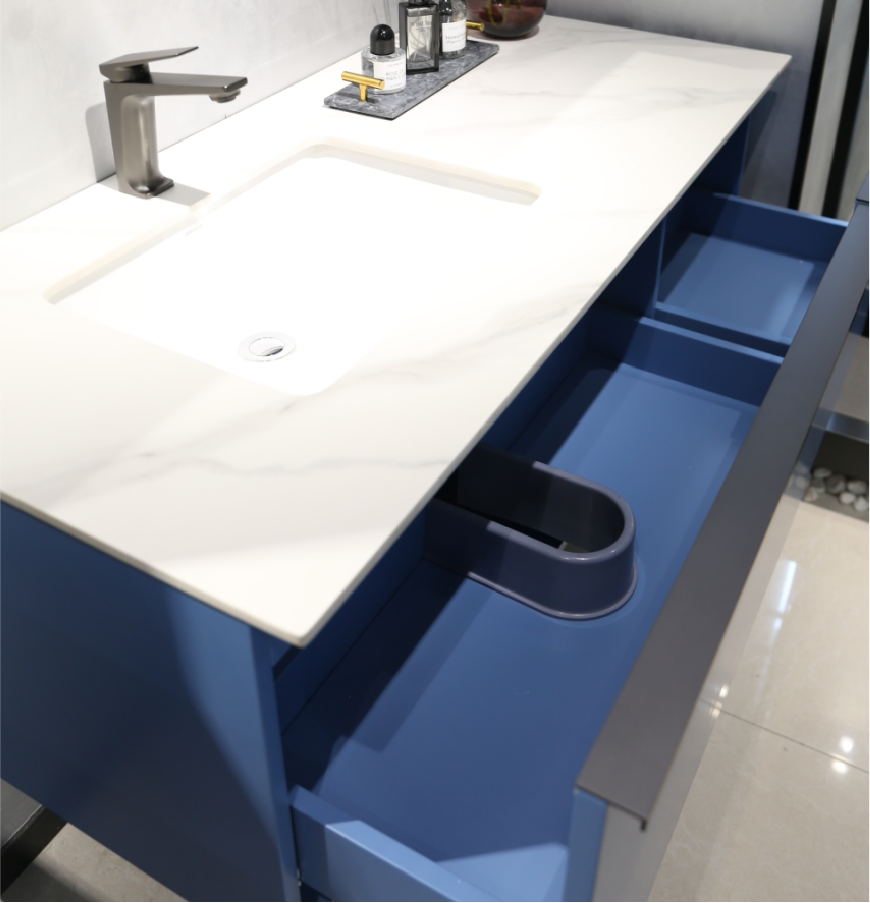 從主柜而言,多層實木貼橡膠木皮,精選具有高密質(zhì)地堅硬的優(yōu)質(zhì)木材,針對浴室水汽多濕度大等特點量身定制,防潮防水防霉效果好;海棠藍明艷不俗,讓原本沉悶的浴室空間增添一抹亮色。